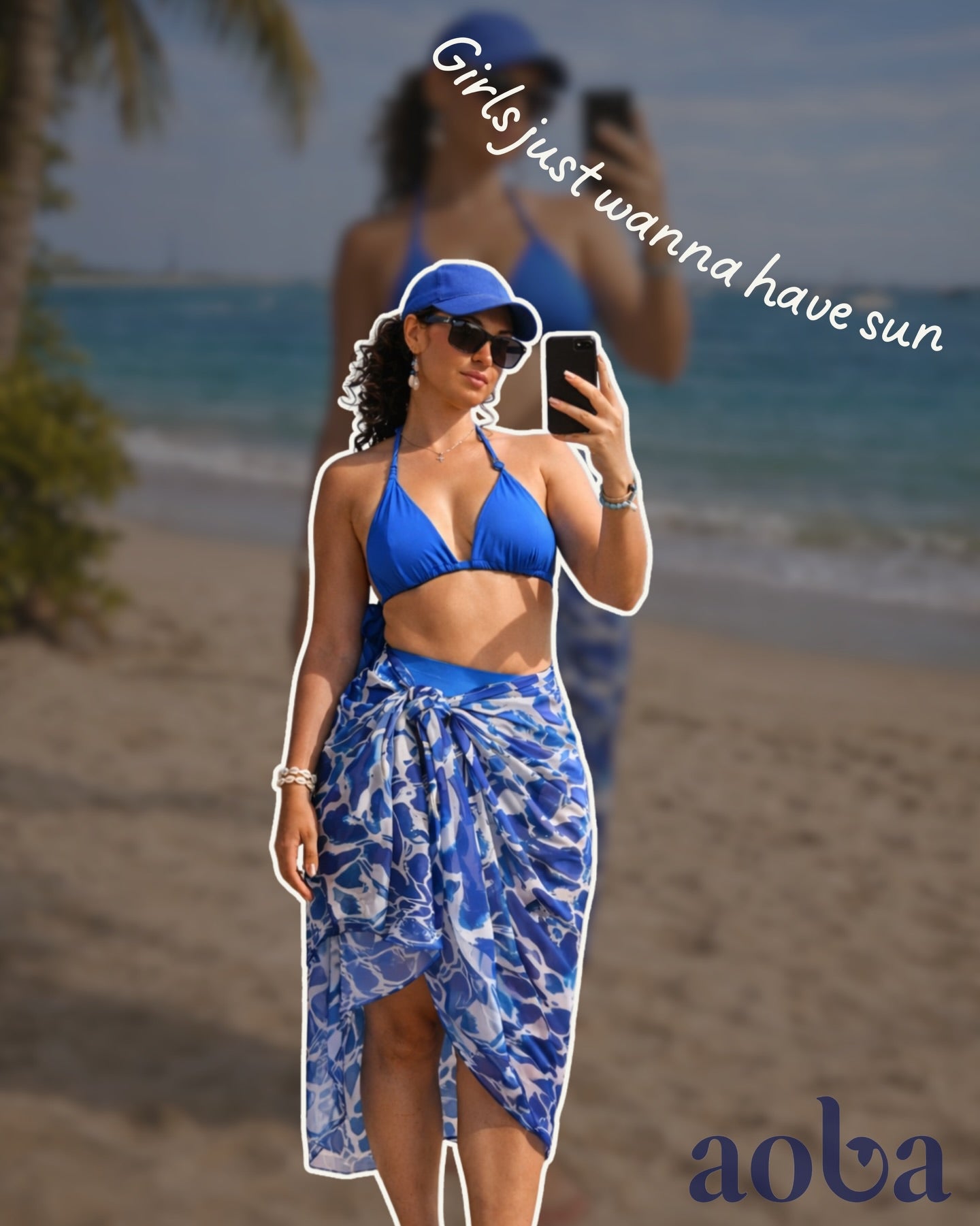 Layered over it, the lightweight printed sarong in bold blue tones adds movement and elegance, making it perfect for styling from poolside lounging to sunset strolls.