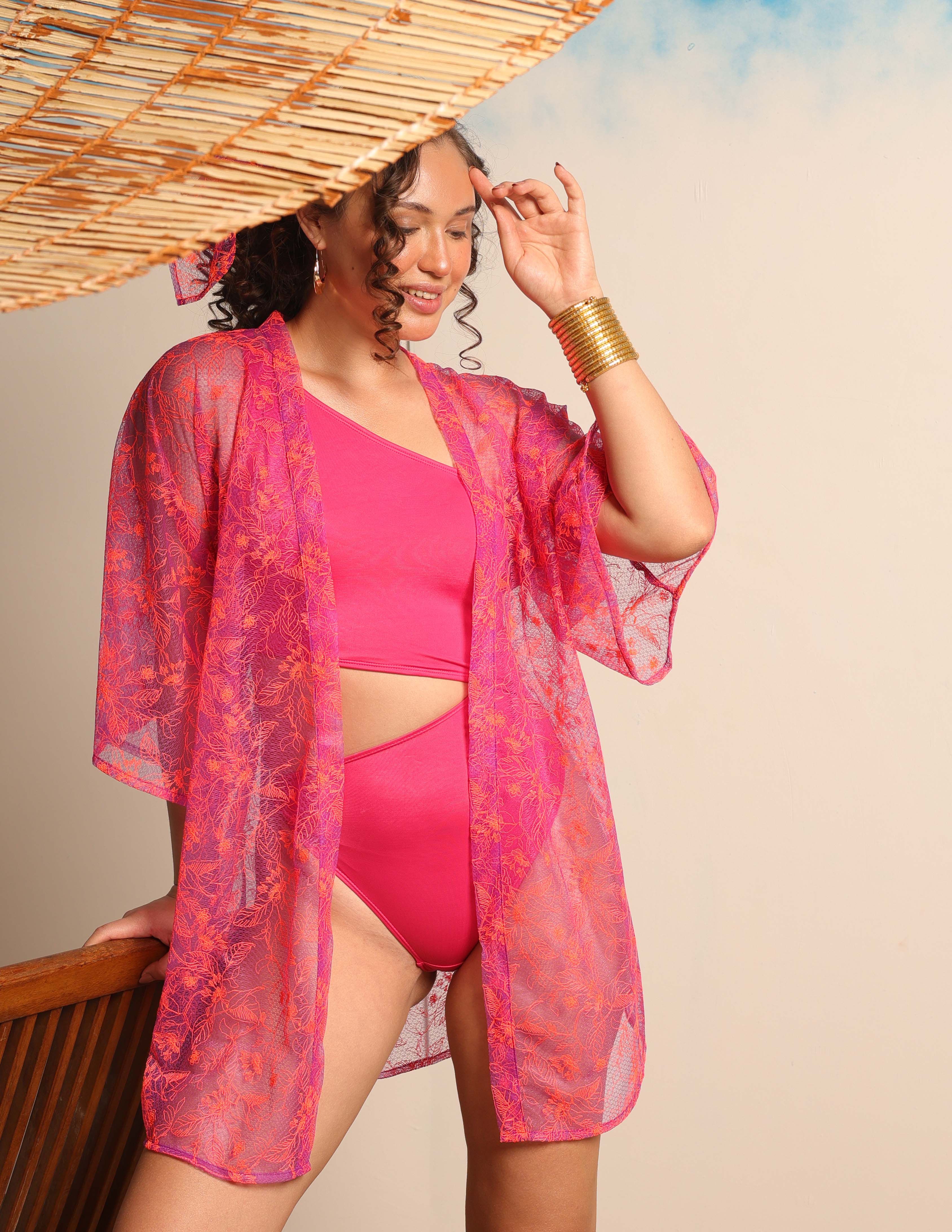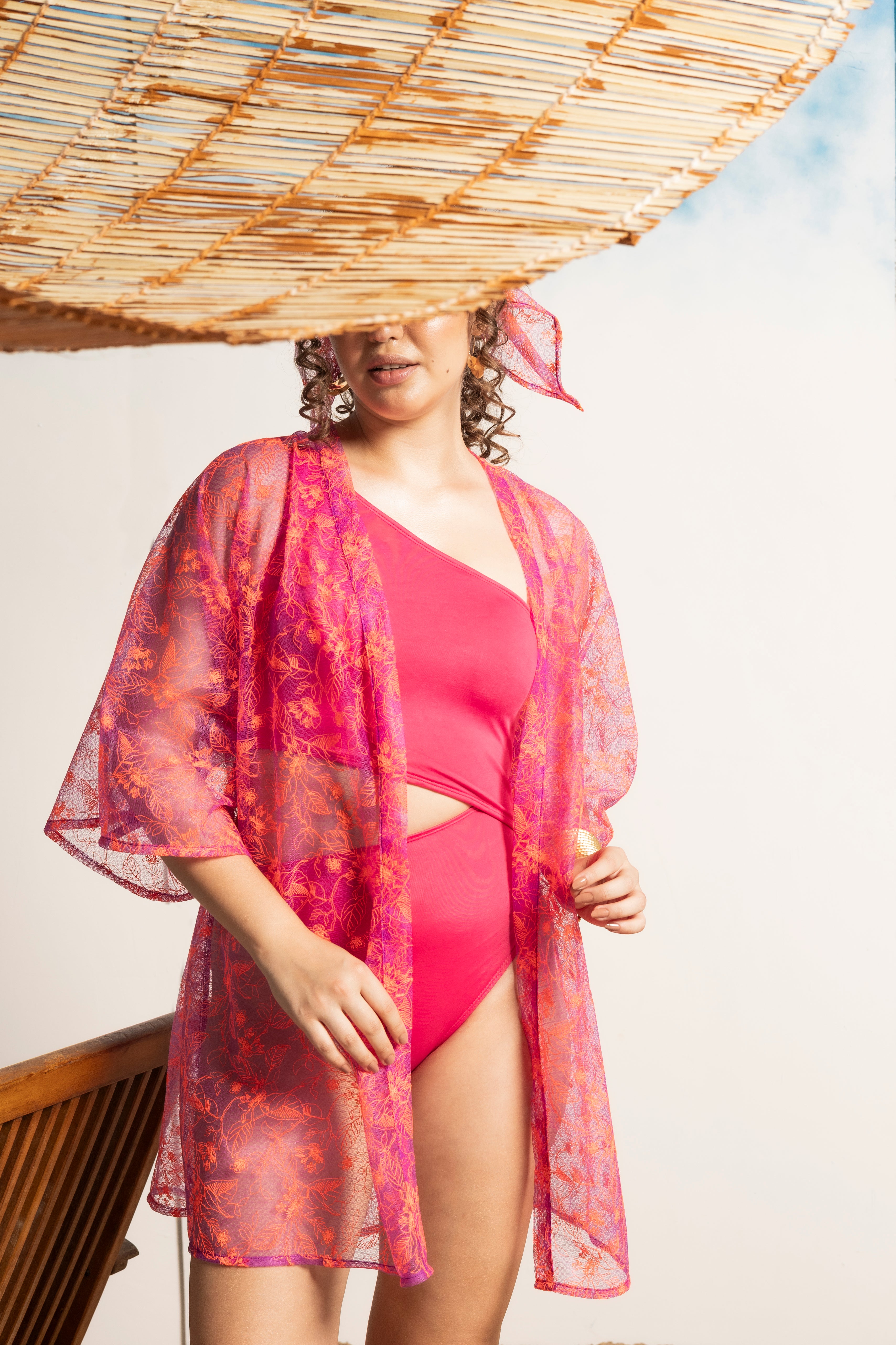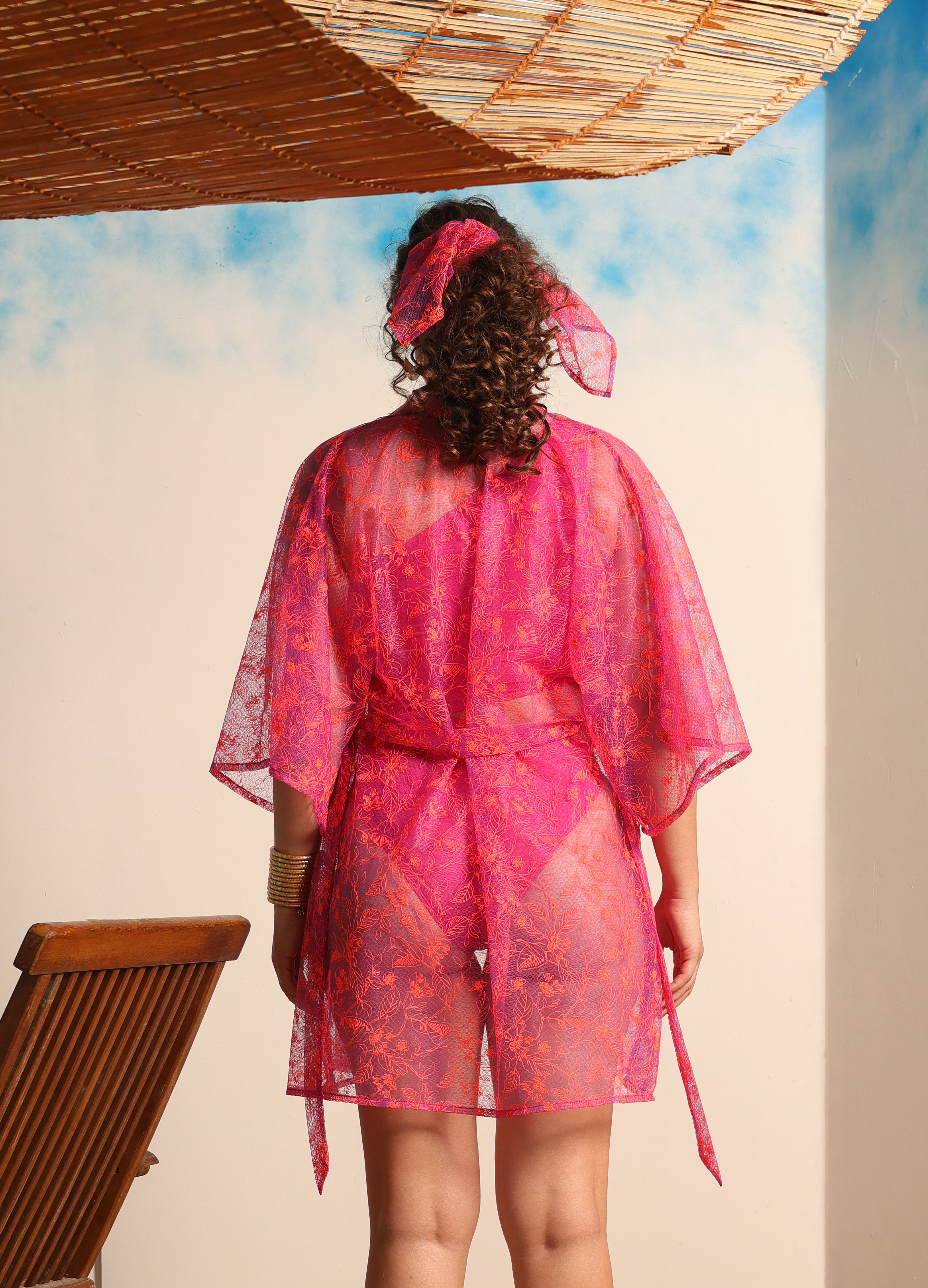 Luxury Cover-Up: A knee-length kimono-style robe made from sheer, breathable lace in contrasting orange/purple florals. Comes with a waist belt to cinch and define your figure.
