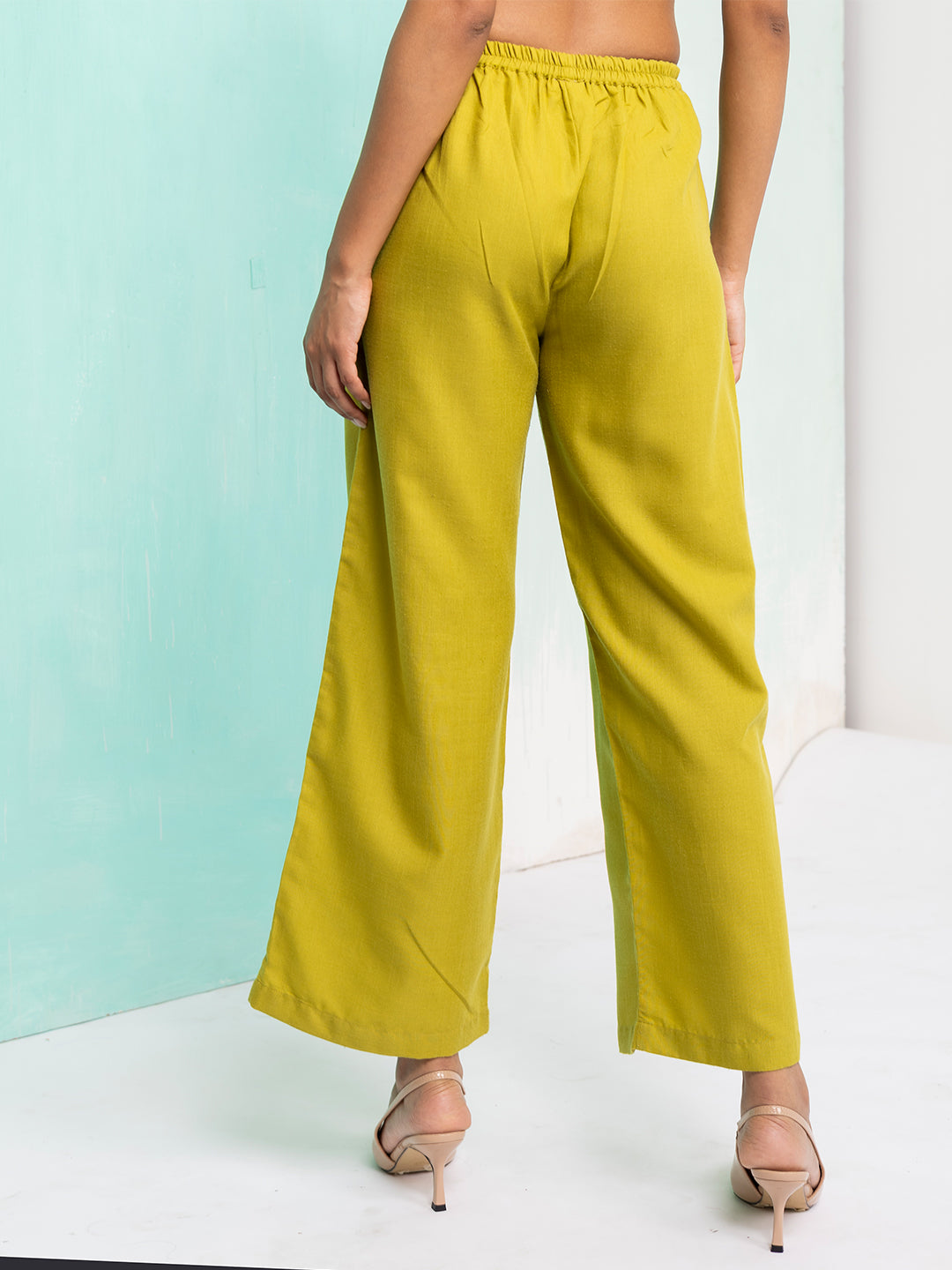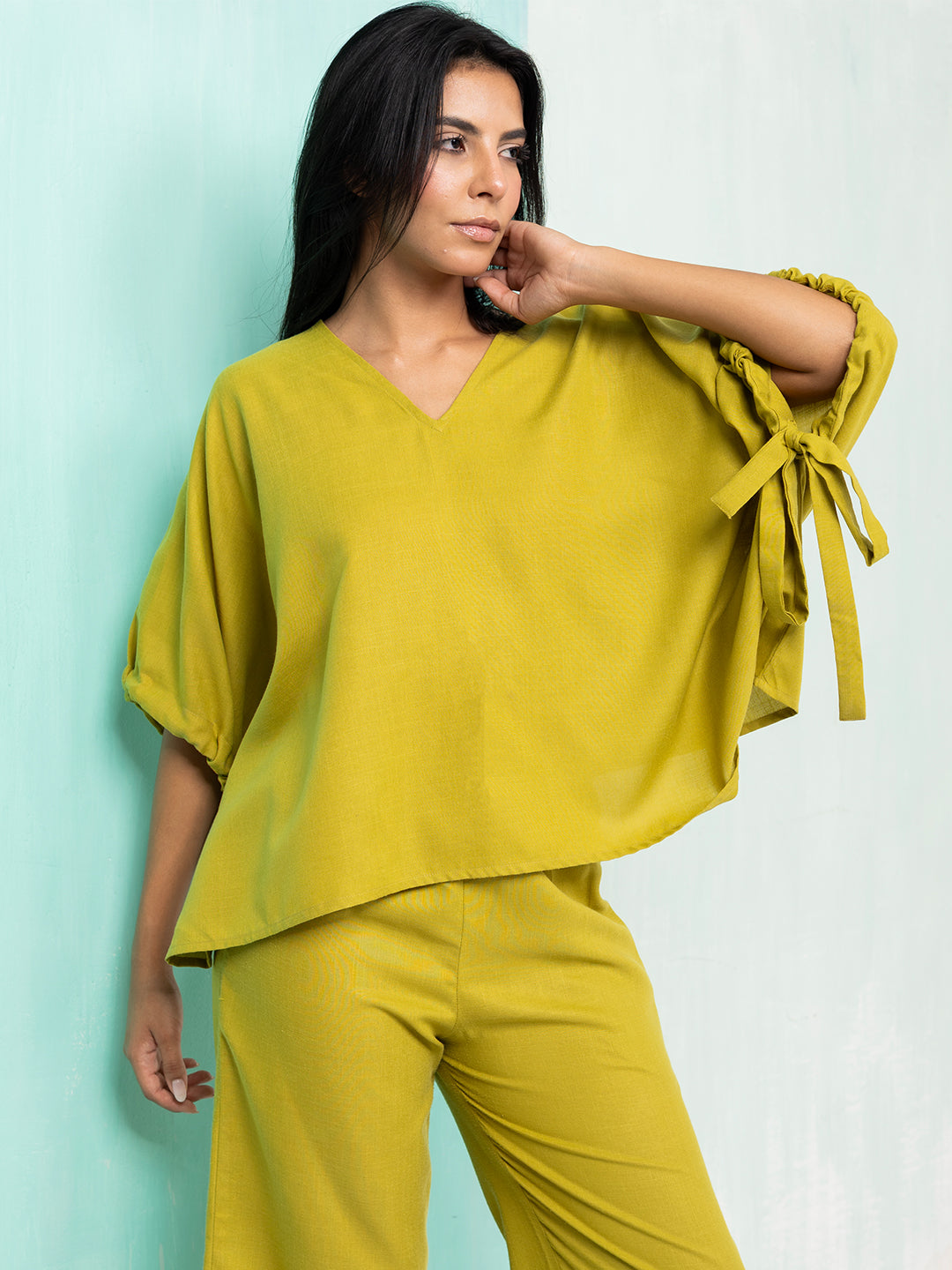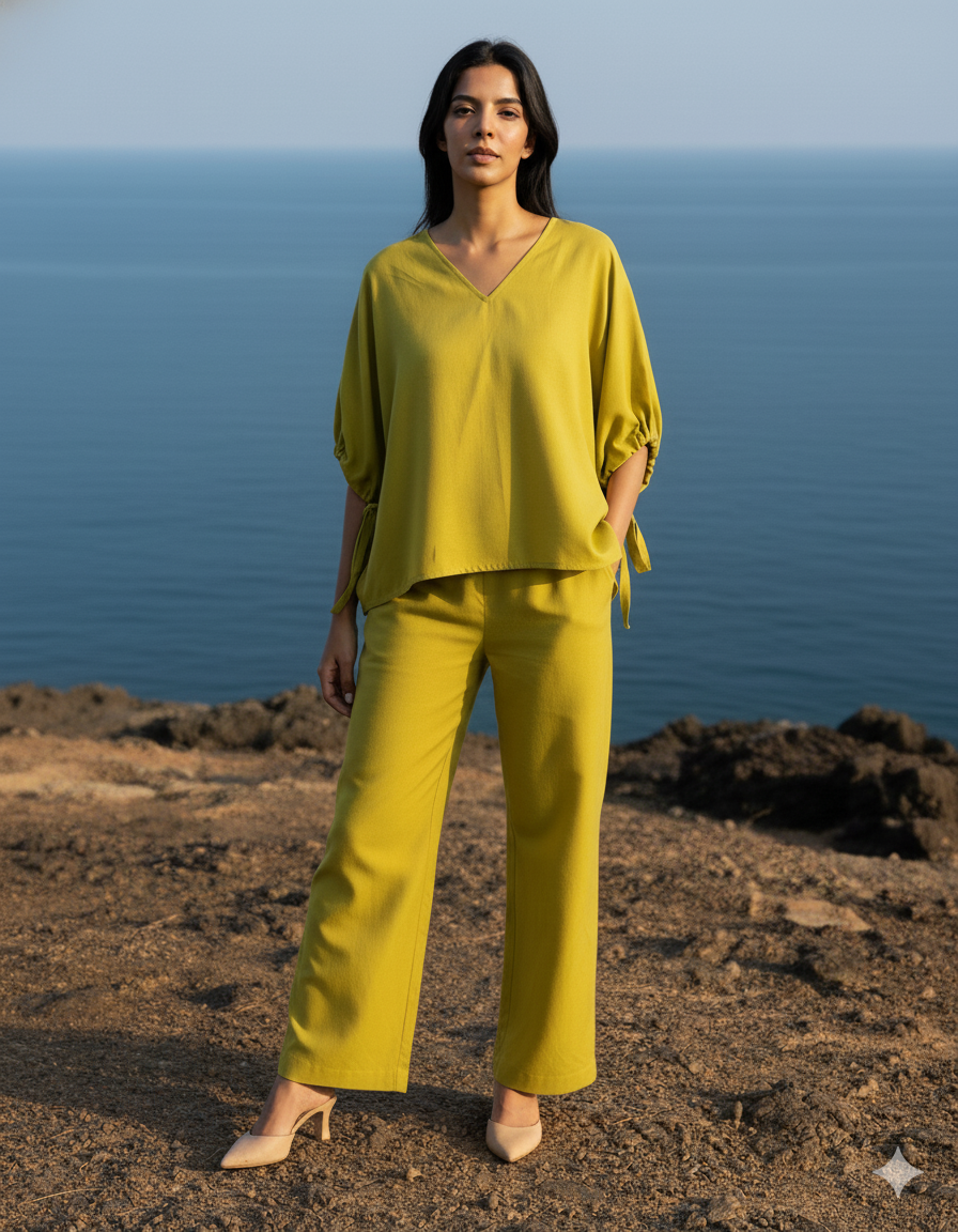 Step into effortless elegance with our Green Linen-Style Co-Ord Set – a perfect balance of comfort and sophistication. Crafted from 100% polyester with a linen-like texture, this co-Ord is designed to give you the breathable, airy feel of linen while maintaining durability and wrinkle resistance. The relaxed-fit top features balloon-inspired sleeves with delicate tie-up strips, adding a touch of playful femininity and movement to your look. The clean V-neckline frames your collarbone beautifully, making it easy to accessorize with jewelry.