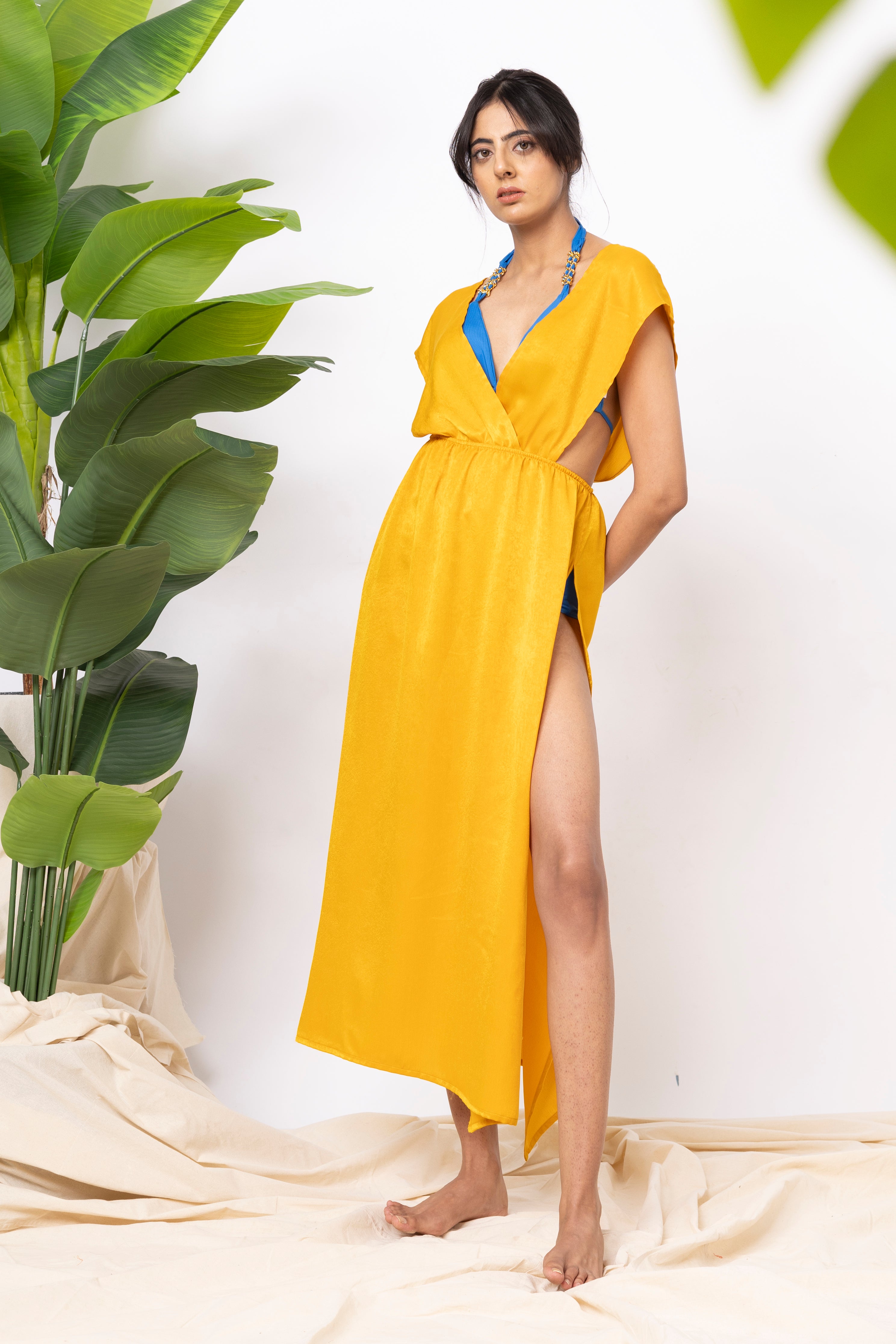 Indulge in resort elegance with our 3-Piece Luxe Swim Set. This collection pairs a vibrant Royal Blue Lycra high-waist bikini with an opulent Mustard Yellow Satin cover-up dress, designed for the most sophisticated beach environments.