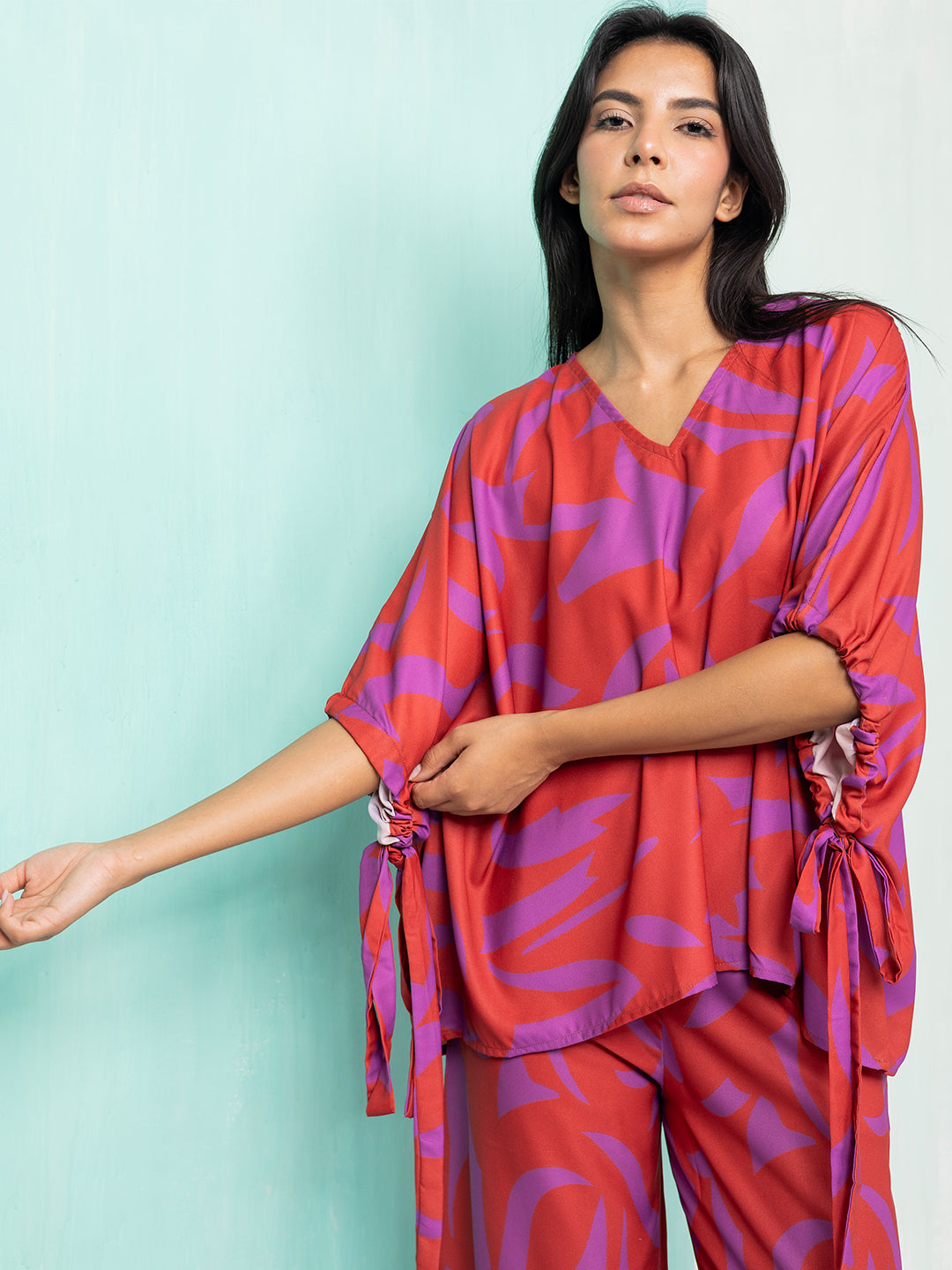 Step into effortless elegance with our Maroon Crepe Co-Ord Set – a perfect balance of comfort and sophistication. Crafted from 100% polyester with a printed crepe texture, this co-Ord is designed to give you the breathable, airy feel of crepe while maintaining durability and wrinkle resistance. The relaxed-fit top features balloon-inspired sleeves with delicate tie-up strips, adding a touch of playful femininity and movement to your look. The clean V-neckline frames your collarbone beautifully, making it easy to accessorize with jewelry.
