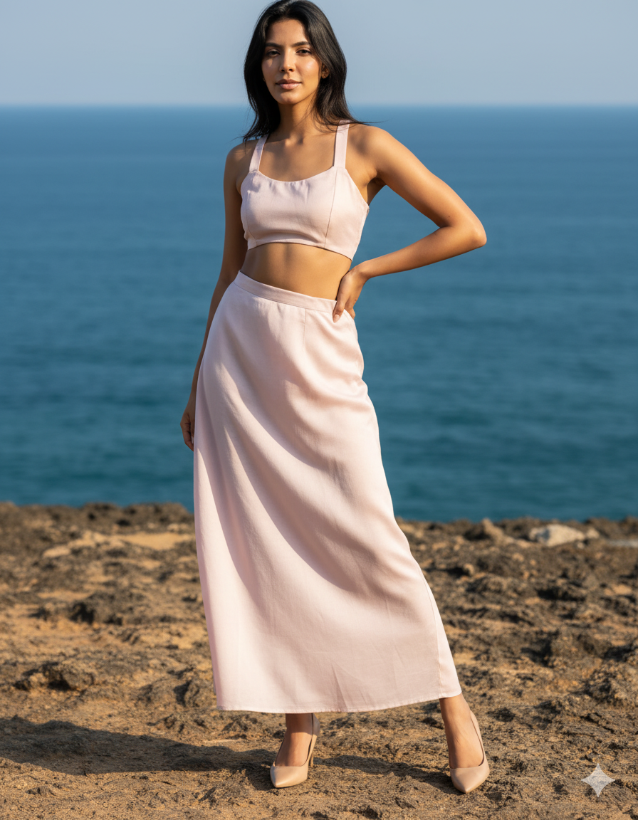 Effortlessly chic and modern, this Baby pick Co-Ord Set brings together minimal elegance with everyday comfort. Featuring a back tie-up crop top and a flowing long skirt, this set is designed to flatter while keeping you at ease. The skirt is detailed with a front belt panel and elasticated back for a structured yet flexible fit, along with a functional pocket for practicality. Crafted from Linen-textured 100% polyester, it delivers a breezy look with easy-care durability—perfect for both casual and elevated occasions.