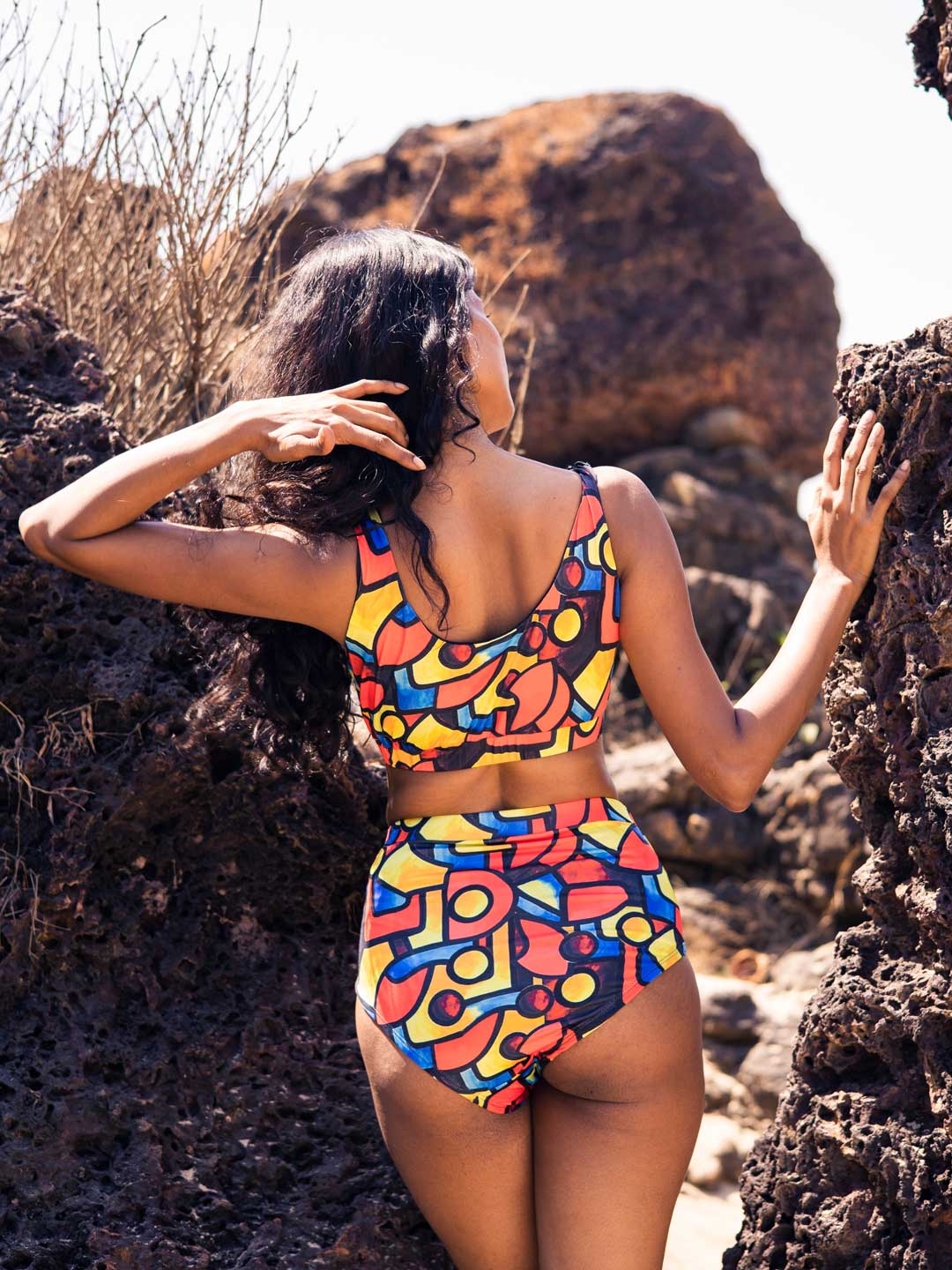 Embrace your inner beach babe and rock the shore with the "Sea Dive Picasso Bikini Swim Set" your passport to beachfront chic! This red and black printed bikini set, consisting of two sassy pieces, is your ultimate go-to for sun-soaked adventures. Our playful and cheeky swim set features a U-neck, sleeveless bikini top with shoulder straps paired with high-waisted bikini bottoms. With elasticated waist and leg openings, double gusset, and fuller coverage, it's designed for confident wear that lets you flaunt your beach-ready attitude.