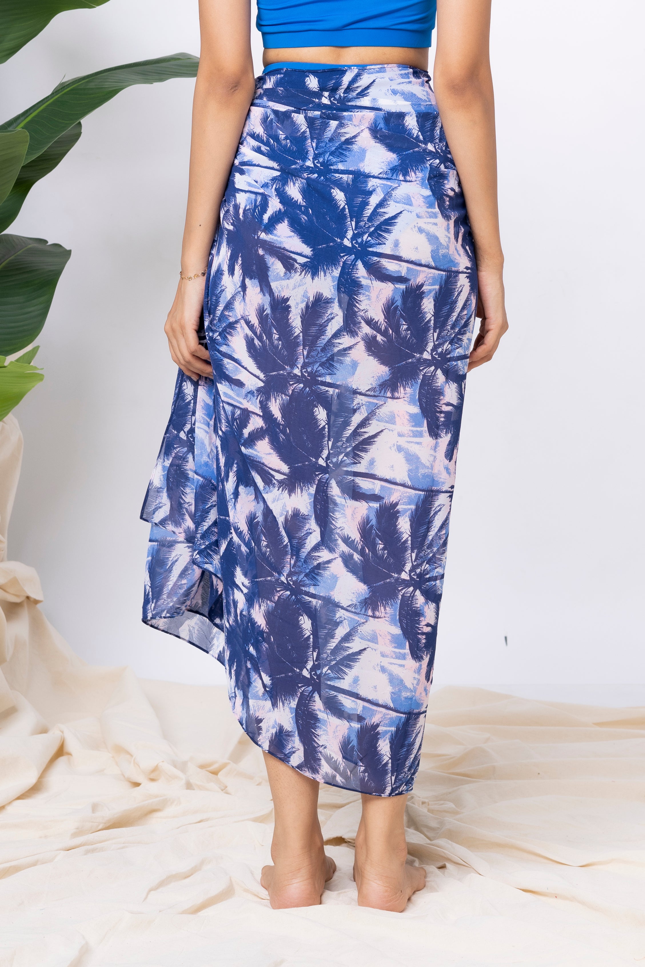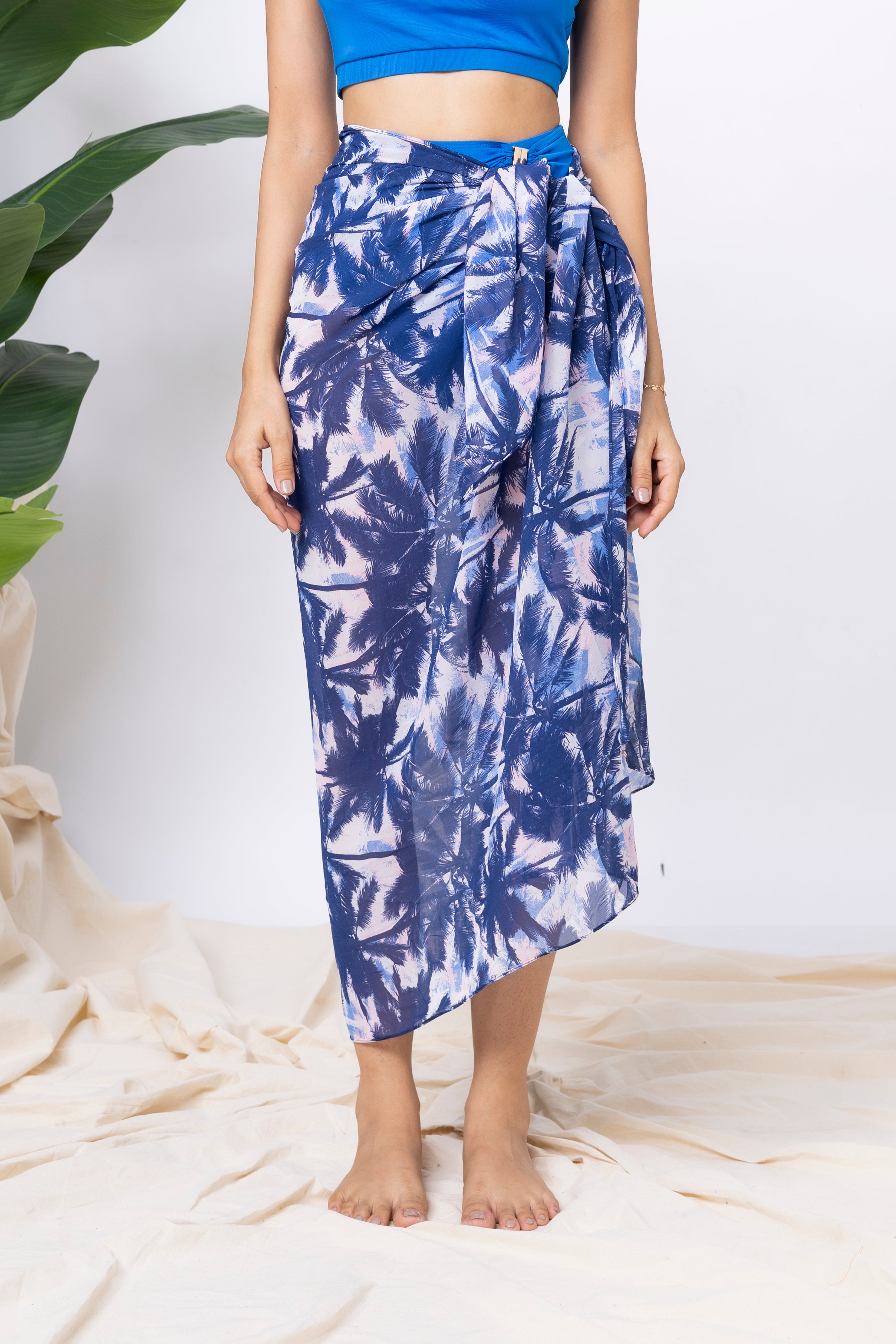 Tropical Cover-Up: Adjustable, tie-knot sarong in a vibrant blue palm tree print for a resort-ready aesthetic.