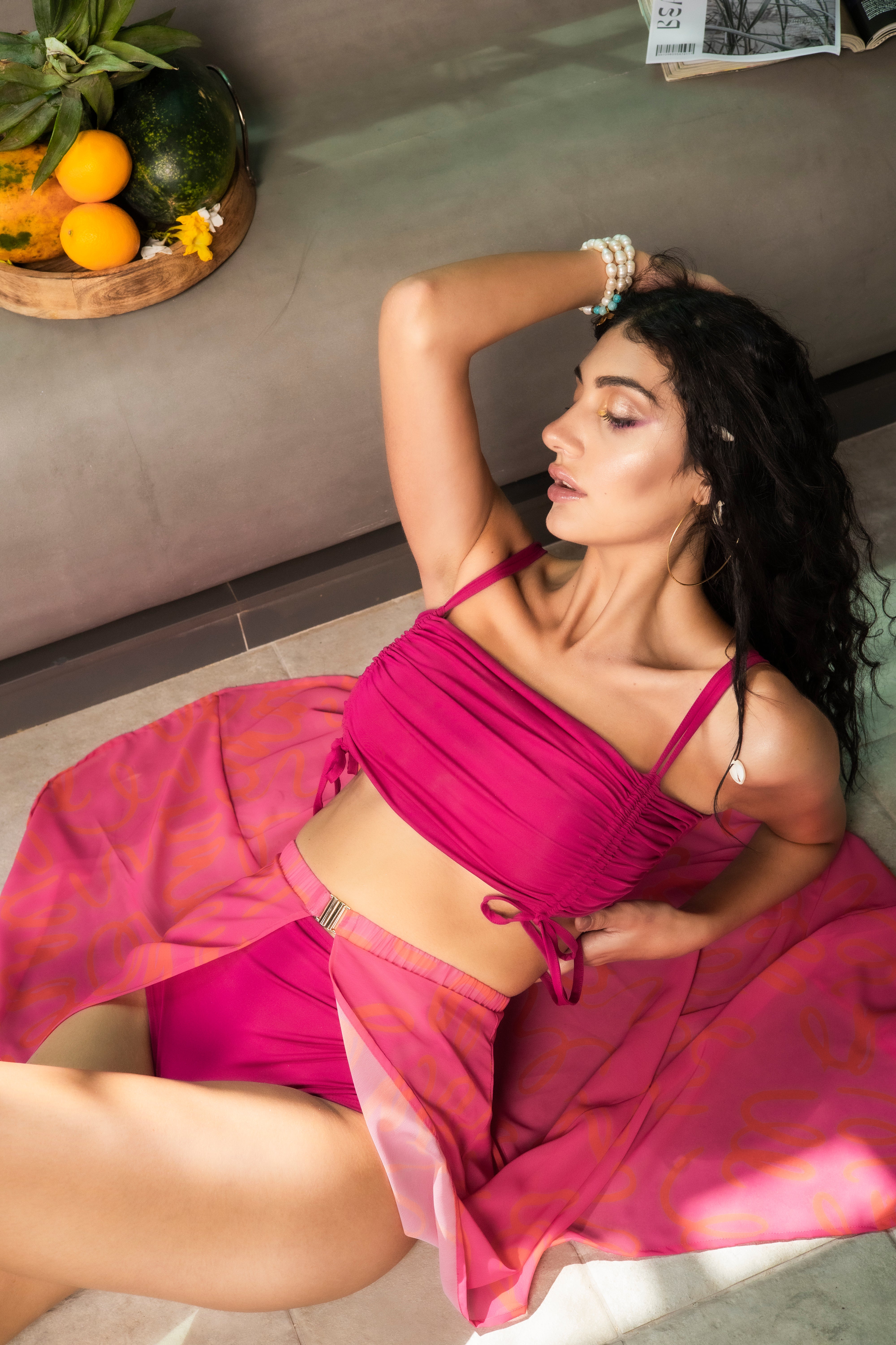 Step into high-fashion resort wear with the striking Fuchsia Drawstring 3-Piece Swimwear Set. This glamorous ensemble features a unique Magenta/Fuchsia Bikini crafted from supportive Lycra. The bikini top stands out with front tie-knot strings and ruching (geathers), allowing you to adjust the coverage and style. The panty is equally daring, featuring side cutouts and tie-up details on the left hip for a contemporary high-cut look. Completing the set is the dramatic, sheer Abstract Printed Cover-Up Skirt. This flowing skirt features a front opening with a stylish buckle closure at the waist, creating a stunning high-slit effect perfect for resort glamour.