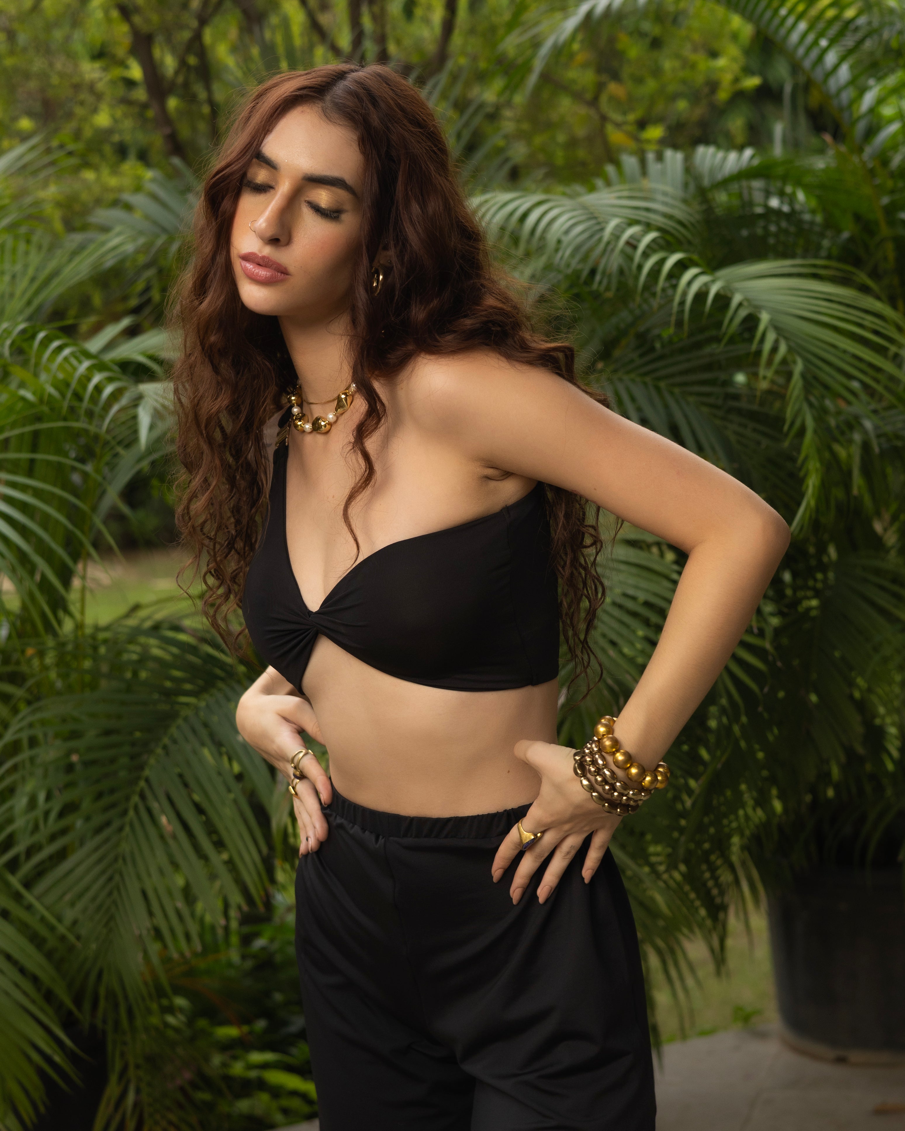 Step into effortless resort chic with the Tahiti Twist Co-ord Set. This statement co-ord balances minimal elegance with bold design. The asymmetric one-shoulder crop top features a flattering front twist detail, while the high-rise wide-leg pants flow gracefully, offering both comfort and style. Designed in sleek black lycra with a soft stretch, this set is versatile enough to take you from poolside lounging to a sunset soirée with ease.