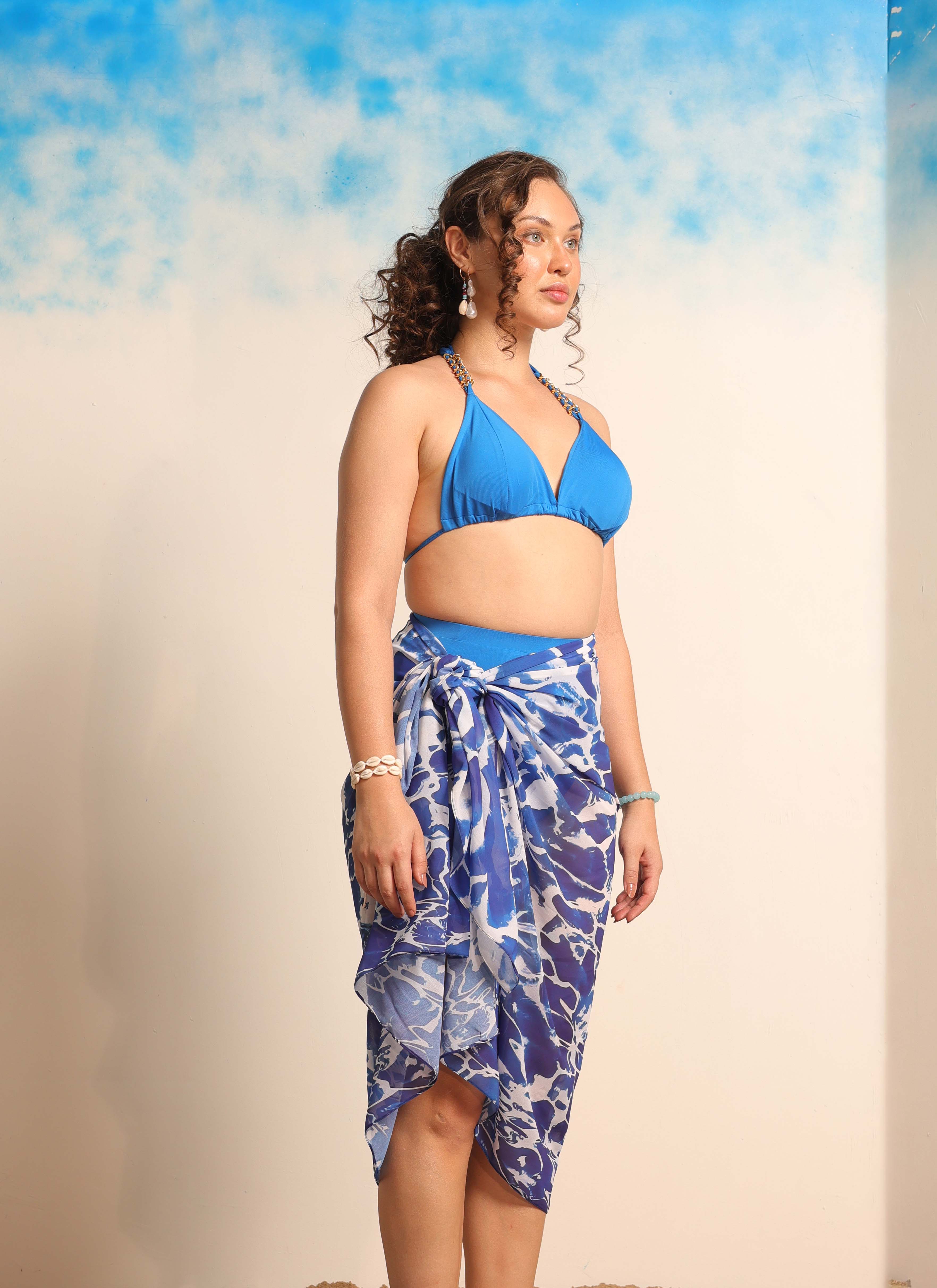 Channel the elegance of the Mediterranean with the Sapphire Chain Set. This striking 3-piece collection features a vivid electric blue hue that looks stunning on every skin tone. The bikini top is designed with padded cups and luxe golden chain accents on the halter neck for a touch of jewelry-inspired glamour. It pairs beautifully with the high-waisted bottoms that offer comfortable tummy control and a sleek silhouette. Complete the look with the semi-sheer Georgette sarong, featuring a mesmerizing abstract ocean-ripple print that captures the essence of summer waves.