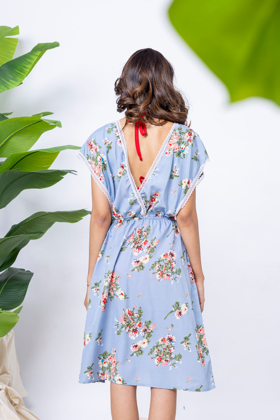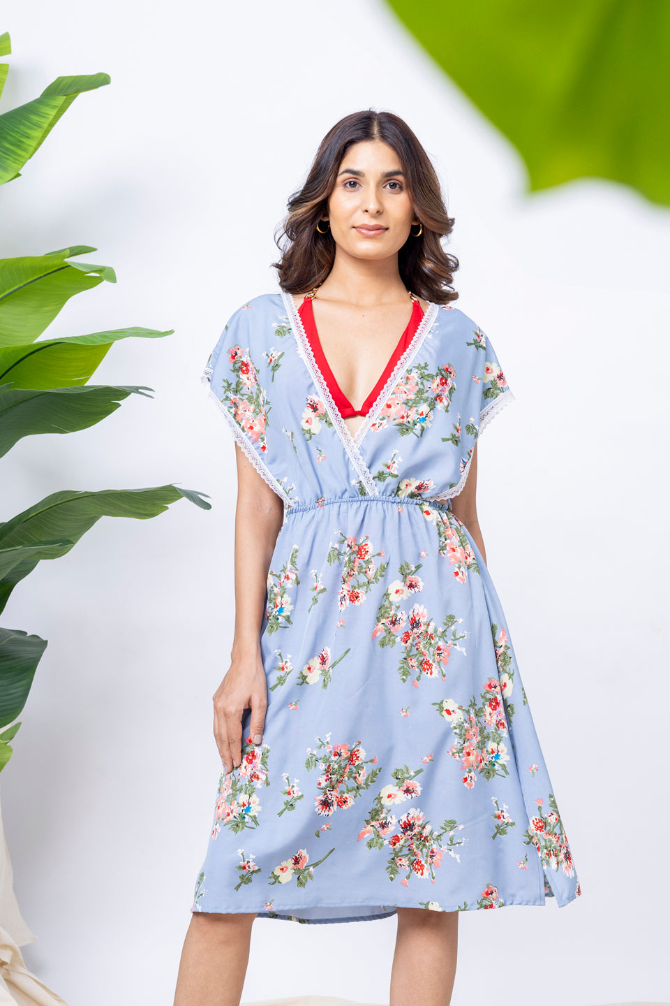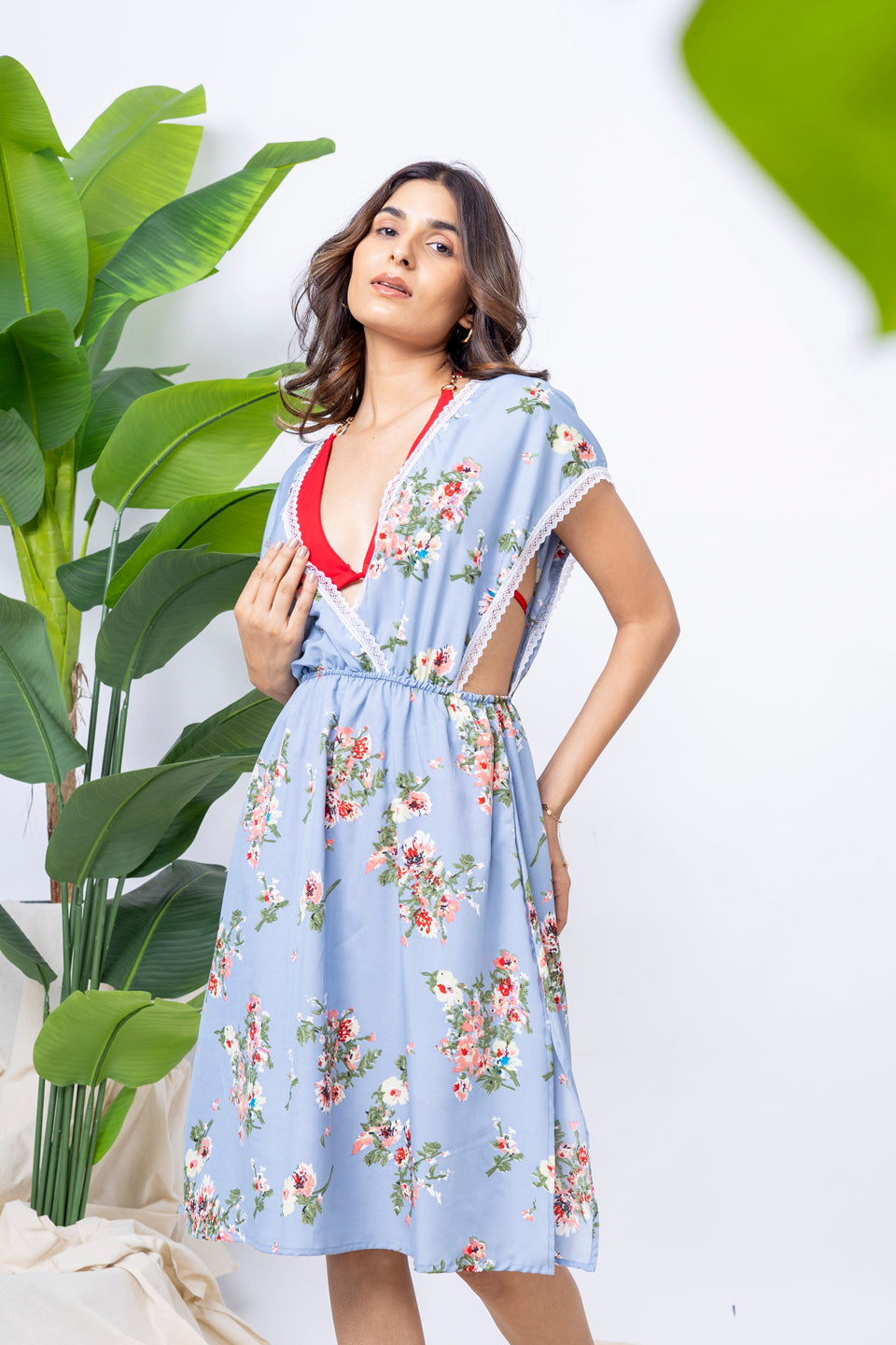 Charming Cover-Up: The dress features a sweet Light Blue and Multi-Color Floral Print, a flattering V-neck with lace trim, and an elasticated waist for shape.